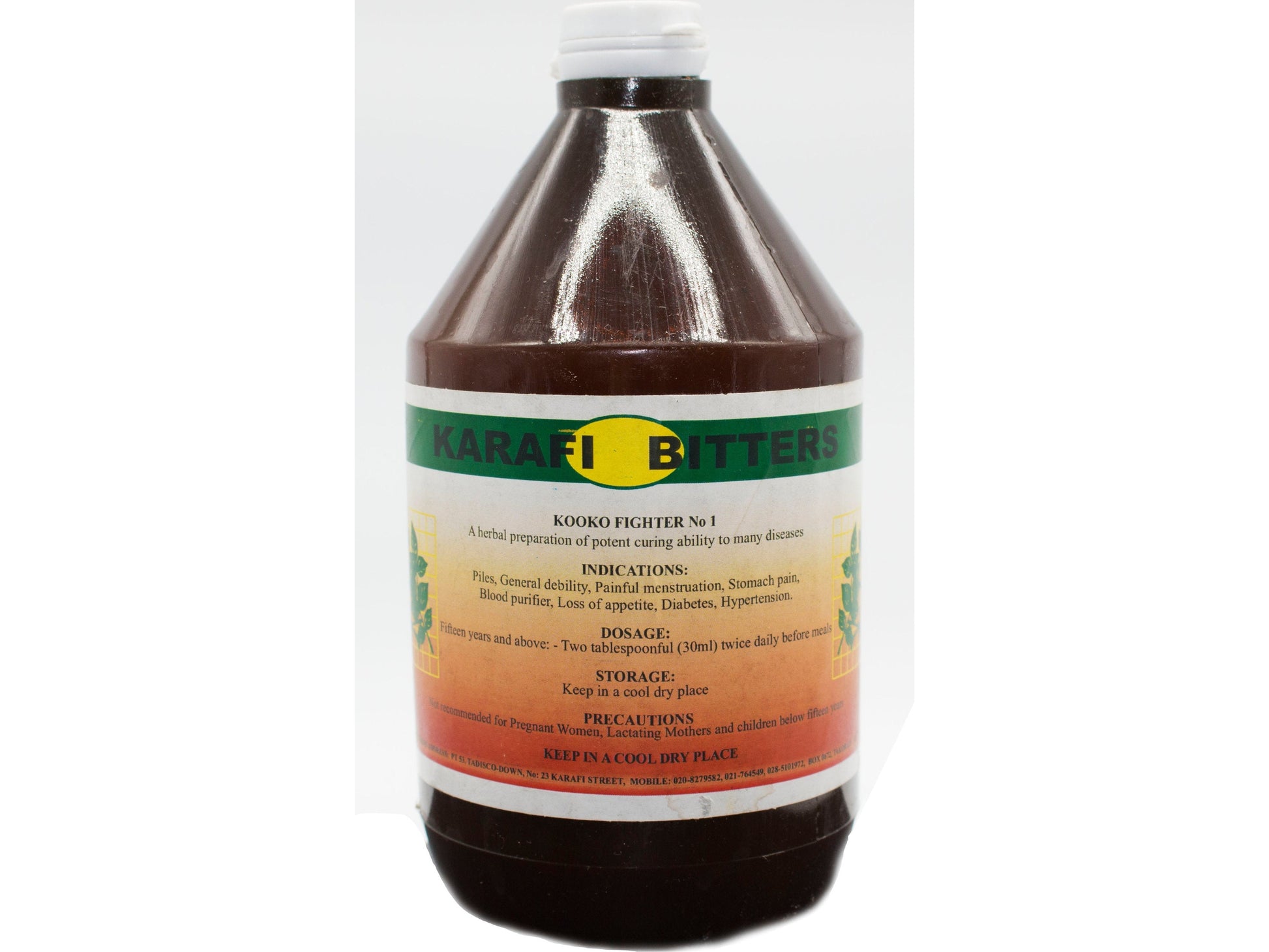 Herbal bitters of potent curing ability to many diseases, piles, painful menstruation, stomach pain, blood purifier, diabetes, and hypertension. A product of Ghana.